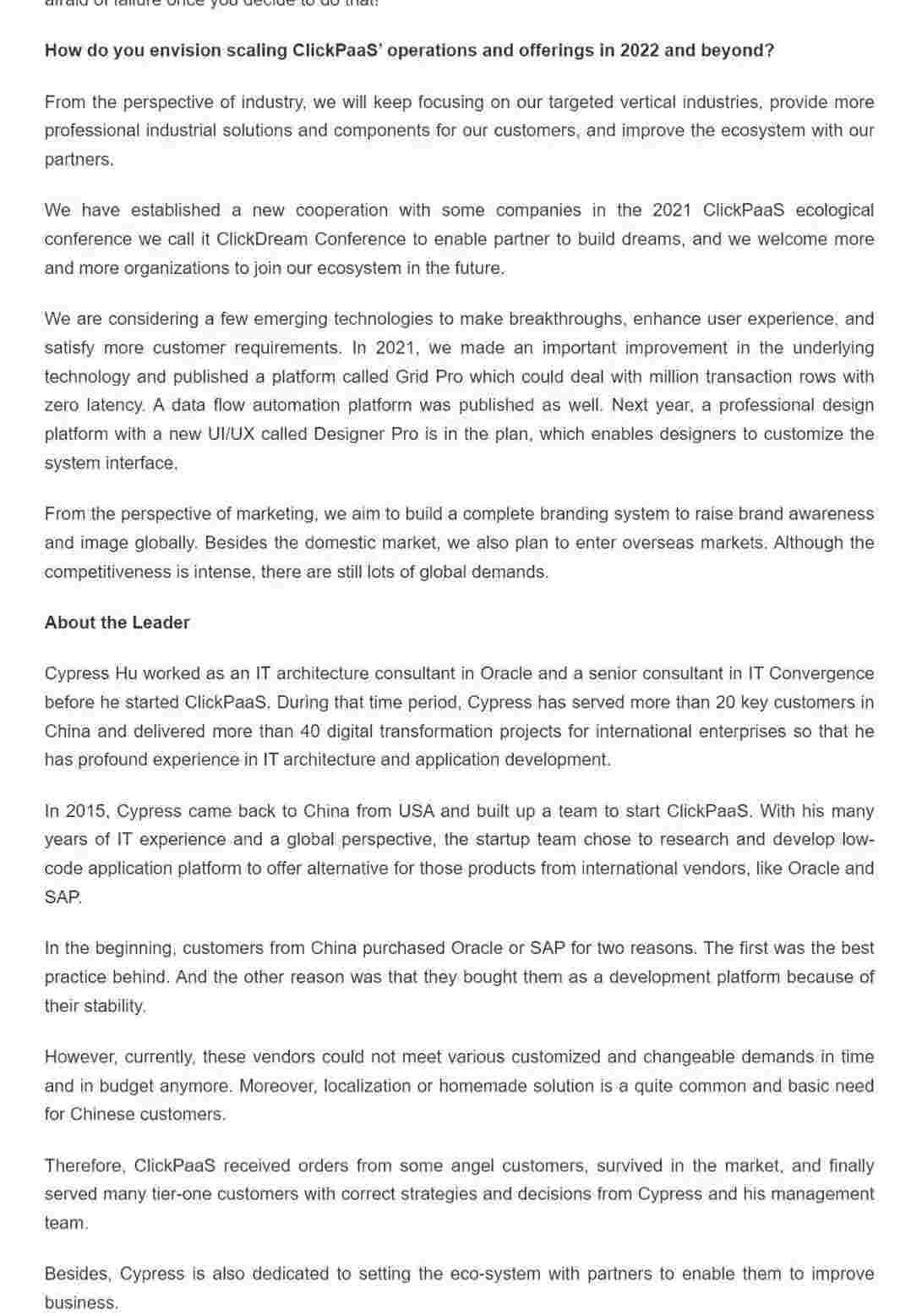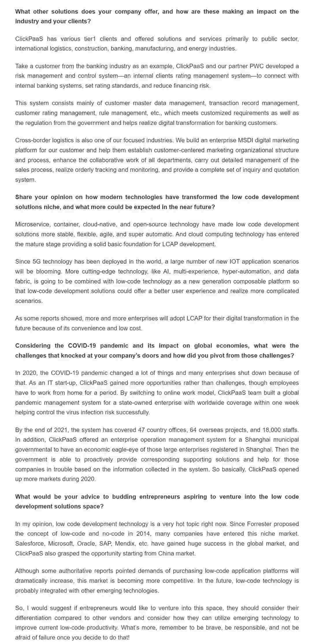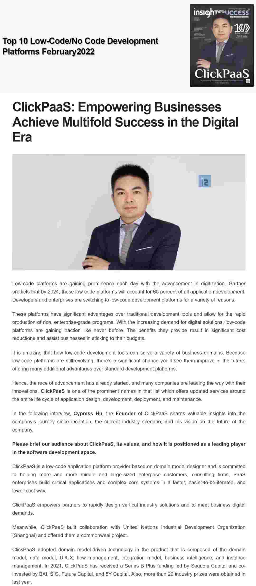 2022年年初,,,,沃钱包入选外媒Insights Success低代码/无代码开发平台 Top10,,,创始人、、CEO胡柏受邀接受专访并荣登封面人物,,,他与Insights Success的读者分享了沃钱包成立的初心、、、、发展历程、、、、当前的行业发展趋势以及他对公司未来的展望。。